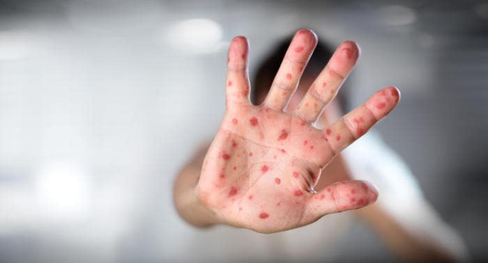 - une éruption cutanée qui commence sur le visage, puis descend sur le tronc, les bras et les jambes,
